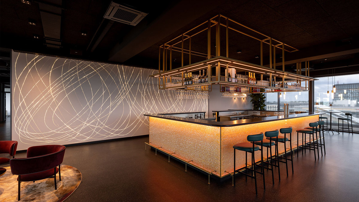Bei der Materialauswahl stand der Anspruch an Qualität und Atmosphäre an erster Stelle. Samt-Loungechairs von Møbel Copenhagen treffen auf Blue Velvet-Stühle von EDRA, die mit ihrer Farbe und Haptik einen reizvollen Kontrast bilden. Messing-gebürstete Oberflächen bei Leuchten, Türgriffen und Accessoires setzen warme, luxuriöse Akzente. Die Bar schimmert golden – realisiert durch hinterleuchtete Acrylflächen die bei wechselndem Lichtspiel eine faszinierende Tiefe erzeugen. Flauschige Teppiche und dunkle Oberflächen fangen das Licht ein, während große Fensterflächen Tageslicht in den Raum fluten – ein Wechselspiel aus Offenheit und Geborgenheit. Das Ergebnis: eine Atmosphäre, die an eine 5-Sterne-Hotelbar erinnert – elegant, sinnlich und einladend zugleich. Ein Ort, an dem man gerne bleibt, auch wenn das Meeting längst vorbei ist.